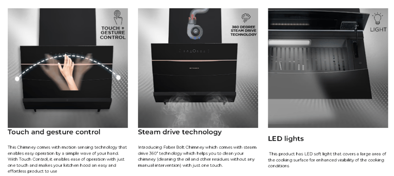 Sporting a steam-based auto-clean feature, the convenient Faber Bolt Chimney does not require manual cleaning. So, with this handy feature, you won’t have to worry about cleaning hassles.